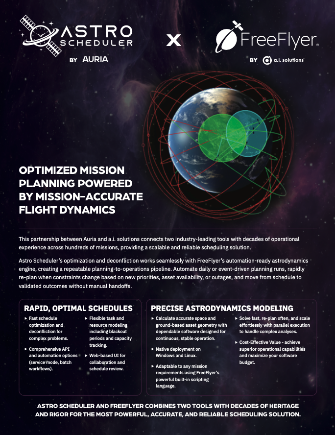 a.i. solutions and Auria have partnered to address these challenges by integrating FreeFlyer and Astro Scheduler into a unified, automation-ready workflow. These tools combine decades of operational experience across hundreds of missions, delivering a scalable and reliable approach to mission planning that supports both day-to-day operations and high-stakes decision making.